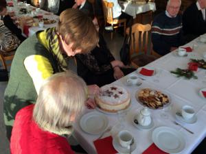 Foto 2: Seniorinnen und Senioren an der festlich geschmückten Weihnachtstafel mit hausgemachten Kuchen und Plätzchen im „Barderup Krug“
