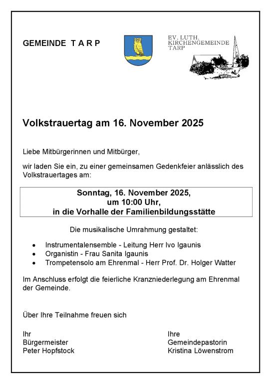 - Einladung zur Gedenkfeier anlässlich des Volkstrauertages in der Gemeinde Tarp