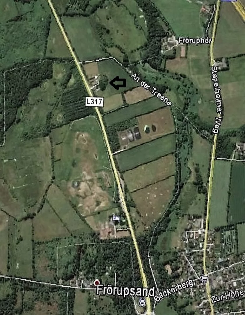 Autofahrer, die sich auf der Landesstraße L317, (der ehemaligen Bundesstraße 76) von Oeversee kommend in Richtung Schleswig bewegen, werden es kaum bemerken, dass sie kurz vor Verlassen des Gemeindegebietes von Frörup an einem der größten Hügelgräber unserer näheren Umgebung vorbeifahren. Radfahrer und besonders Fußwanderer werden sie aber schon gesehen haben, die beiden Grabhügel beim landwirtschaftlichen Betrieb der Eheleute Helmut Möller in Frörup.Während es sich bei dem flacheren um einen überpflügten Hügel von 20 m Durchmesser und 1,5 m Höhe handelt, weist der größere die imposanten Ausmaße von 25 m Durchmesser und gut 6 m Höhe auf. Nach der Flurkarte von 1805 wird dieses historische Gelände „Thinghuisblock" genannt. Pastor Henningsen aus Oeversee (1854-64) wies mit einem Schreiben an das Kgl. Amtshaus in Flensburg auf „Thinghui" hin und merkte an, dass der Grabhügel zu jener Zeit noch nicht „durchgraben" gewesen sei. Zwischenzeitlich, so meinen ältere Bürger, sei der große Hügel von oben geöffnet worden. Auch seien nicht wenige Kubikmeter Sand von dort abgefahren worden.