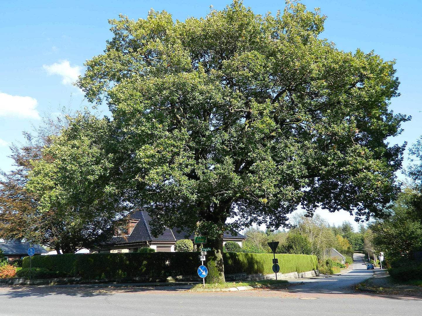 Die Fröruper Friedenseiche hat schon viel Stürme und Schneekatastrophen überstanden. Sie hat das Kaiserreich und zwei Weltkriege miterlebt, hat die Weimarer Republik und das sogenannte 1000-jährige Reich überlebt. In unserer heutigen freiheitlichen Bundesrepublik fühlt sich der Baum scheinbar besonders wohl, denn er denkt noch lange nicht daran abzutreten, sofern die Menschen ihm das Lebensrecht nicht nehmen. Seine Zukunft war schon einmal durch den geplanten Ausbau der Dorfstraße in Gefahr. Der Standort machte den Planern Schwierigkeiten. Die Eiche sollte am liebsten verschwinden. Jedoch Bürgermeister und Gemeinderat haben sich dafür eingesetzt, dass das alte Fröruper Wahrzeichen mit seiner großen Vergangenheit erhalten bleibt. Man hat eine Verkehrsinsel gebaut und den Straßenverkehr auf dem Stapelholmer Weg und Bäckerberg um sie herum geführt.