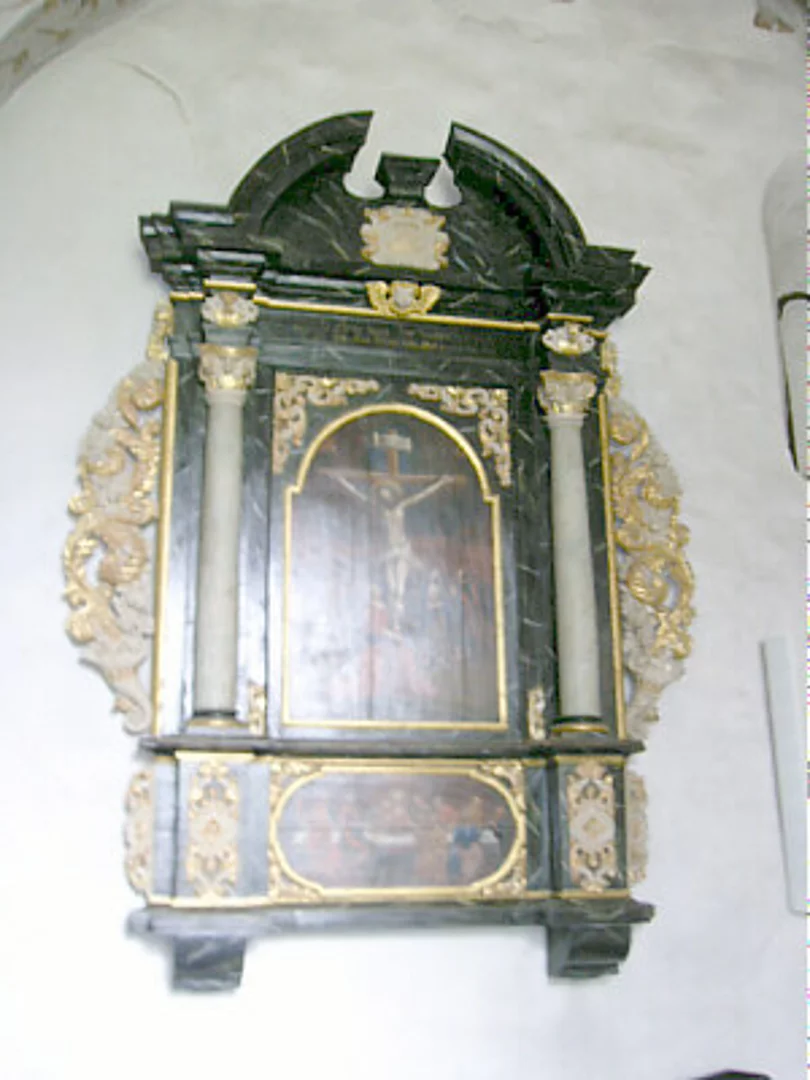 - Der barocke Altaraufsatz, seit 1965 an der Nordwand des Kirchenschiffs,