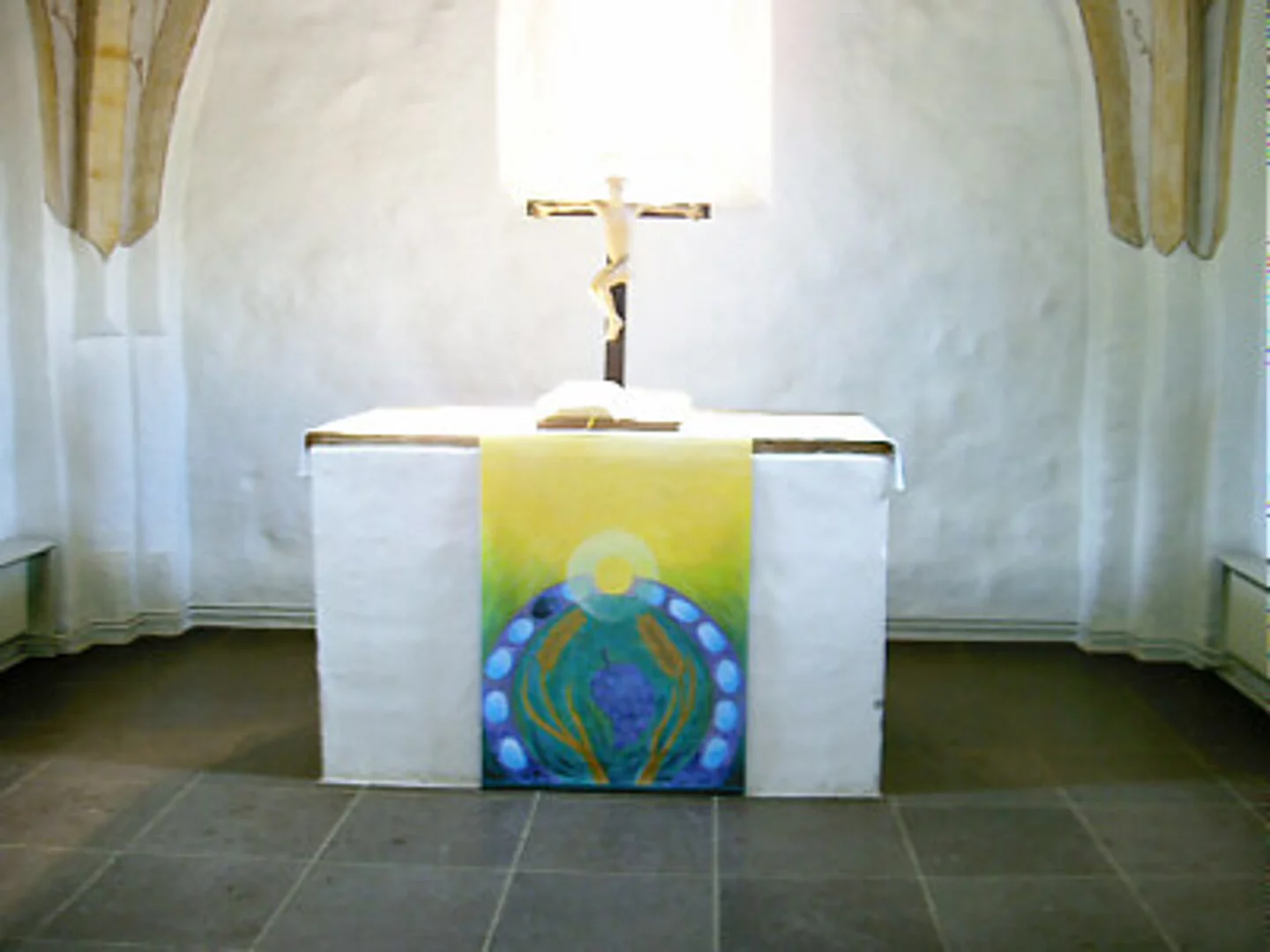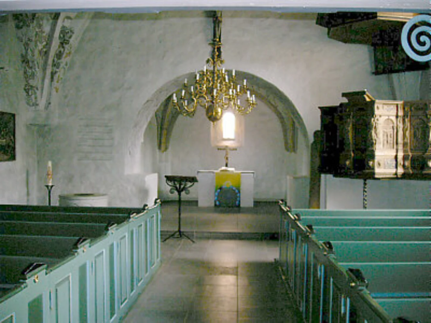 Aus der Zeit der Erbauung der Kirche stammen der Altar (zu beachten sind die fünf Weihkreuze in der von einem alten Eichenholzrahmen eingefaßten Platte aus gotländischem Kalkstein) und die Taufe, ebenfalls aus gotländischem Kalkstein, die im Jahre 1968 restauriert und mit einem neuen Fuß versehen wieder aufgestellt wurde, nachdem sie mehr als 250 Jahre (seit 1714 stand in der Kirche eine Rokko-Taufe aus Holz) auf einem Hof in der Gemeinde gelegen und dort lange Zeit als Viehtränke gedient hatte.